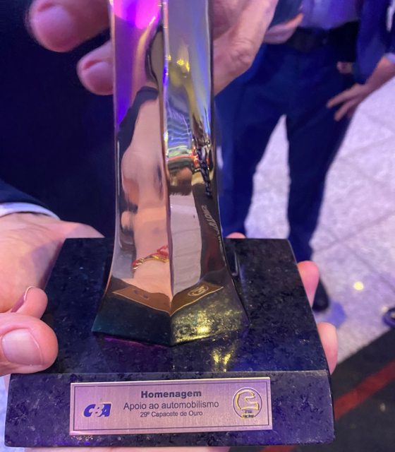 A jornalista Isabel Reis, realizadora do prêmio e já em plena preparação da 30ª edição em 2026, entregou para o presidente um autêntico Capacete de Ouro, uma homenagem pelo trabalho desenvolvido desde que assumiu a presidência da entidade técnico-desportiva.