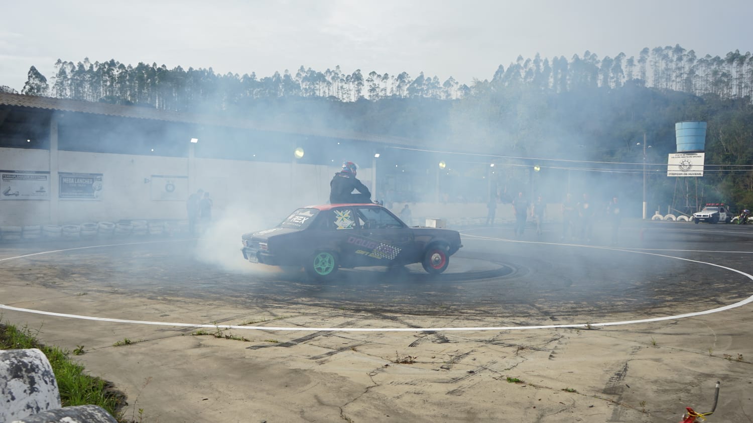Isso ocorre porque o setup permite que o carro mantenha o acelerador acionado, velocidade constante e freio de mão puxado, de modo que o giro aconteça no meio do círculo. Em busca do objetivo, Douglas Eduardo Brunes entrou no carro, acionou o motor e começou a girar em volta do próprio eixo, mas ainda sem contagem, que só começa quando ele está efetivamente sentado no Chevette, que gira.