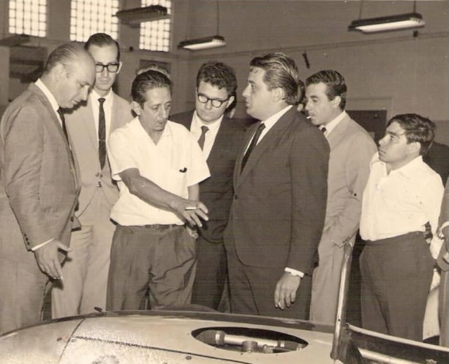 2: No primeiro plano, Francisco Landi (camisa de manga curta) ladeado pelo pentacampeão mundial de Fórmula 1, o argentino Juan Manuel Fangio, e Luiz Antonio Greco